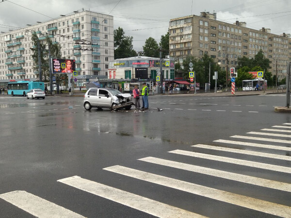 На перекрестке у станции местро Дыбенко всмятку разбилась легковушка
